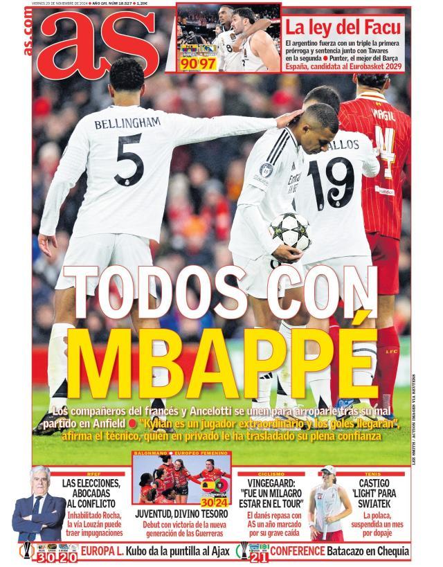 《马卡》报和《阿斯》报时常会出现一些不约而同的头版头条和专题报道,这后面往往来自老佛爷的授意。例如11月29日的这次统一行动。《马卡》报头版说,全皇马都在捍卫姆巴佩,但是配图很有意思,是球员通道里姆巴佩背靠墙壁,站在一群球员中间,看上去这是队友们团结在姆巴佩身边,其实视频可以证实,当时队友们正在互相鼓励,唯独姆巴佩被彻底冷落了。倒是《阿斯》报头版配图略更自然,是贝林厄姆在场上对姆巴佩摸头鼓励。